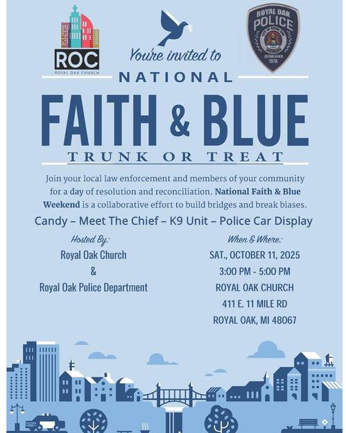 Help spread the word about this awesome event happening right here @ the ROC. Faith and Blue weekend is coming soon!!! The Royal Oak Police Department will be sponsoring and putting on an amazing Trunk or Treat event right here at ROC on October 11th from 3pm-5pm. You will not want to miss this amazing event.